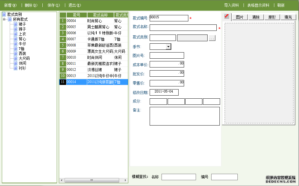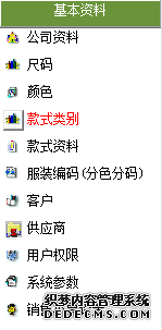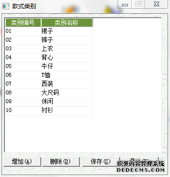 点“款式类别”,弹出编辑,点“增加”增加款式类别,点相应类别,点“删除”可删除相应类别,最后“保存”,“退出”。