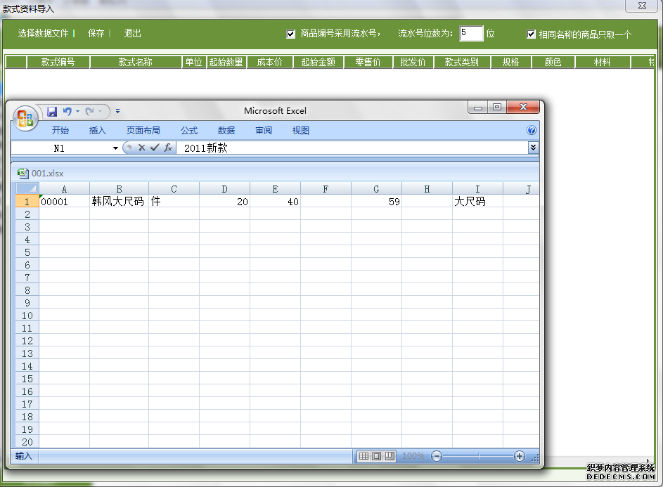 1、先在Excel里把商品资料对应着导入表打入Excl表中,不需要打入的按tab键空过(列数及位置与导入界面网格一致)。